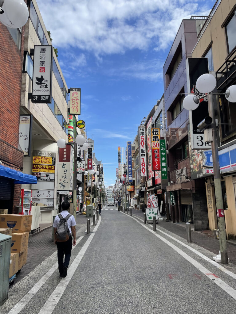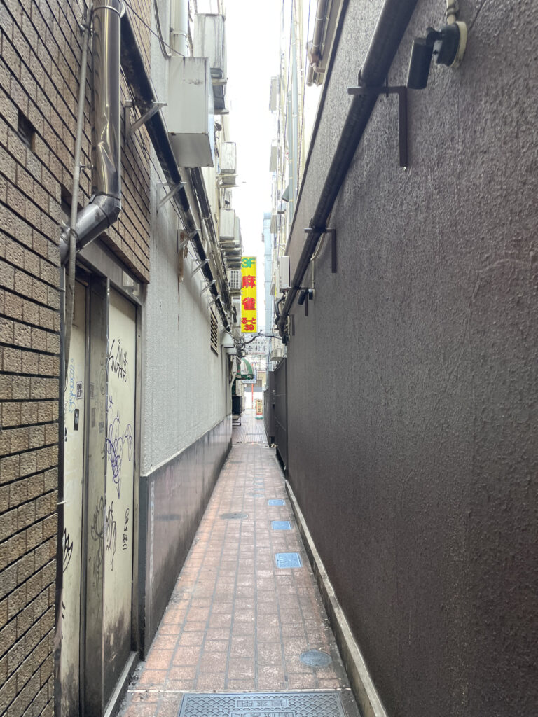 地上に戻り、商店街の方に移動。ここは2人がバンドマンから逃げ回る場面ですね。路地裏には飲み物かけあった(大迷惑)居酒屋さんがありました。そういえば雀荘もあったけどやってるか分からんかった。