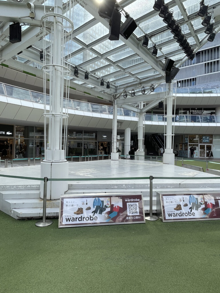 そのあと駅前に戻ってラゾーナ川崎プラザへ。ここには新川崎(仮)として初ライブをやったステージが設置されてました。ここがラゾーナの構造も相まってかなりの迫力です。円形の広いスペースを3階建ての建物が取り囲んでるんですよね。アニメではここが完全に再現されており、大きなステージの前に立つと、その光景が目の前に映し出されたかのような不思議な気分になりました。