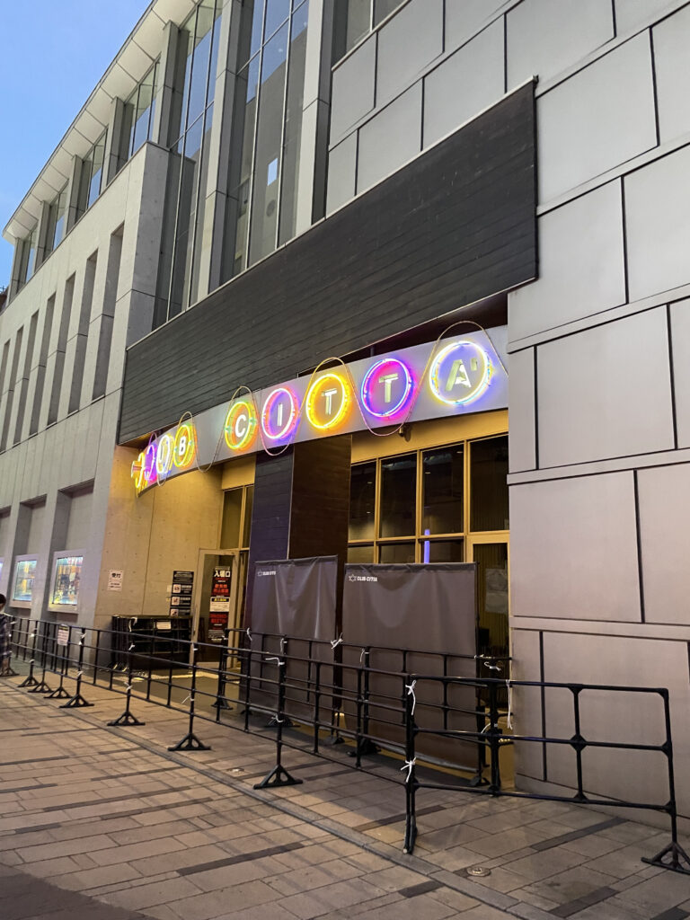 夕方になり、近くに住むサークル元代表と会うことになったので、時間つぶし。近くには最終話ライブ会場となったクラブチッタがありました。中には入れませんでしたけど、ネオンサインはまさにそれでした。(以前行ったZepp Tokyoに近い雰囲気を感じた)映画の応援上映もやってたみたいで、うらやましい限りです。